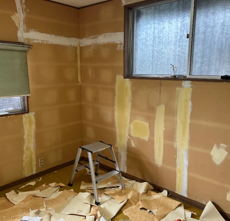 ・床は大引き(躯体)を残して全て撤去後に、GL(大引きが極端にアーチを描く)を平らに戻して、下地を補強しながら、CF(クッションフロア)下地のコンパネを張る。